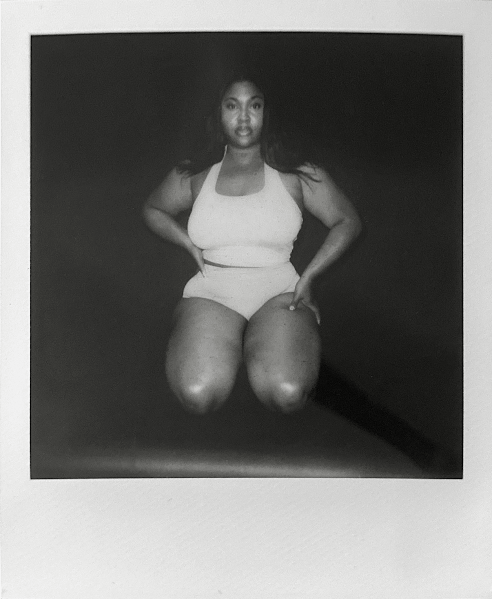 Black and white Polaroid photo of a woman kneeling on the ground, looking at the camera, wearing a light sports bra and shorts, with long hair and a confident expression.